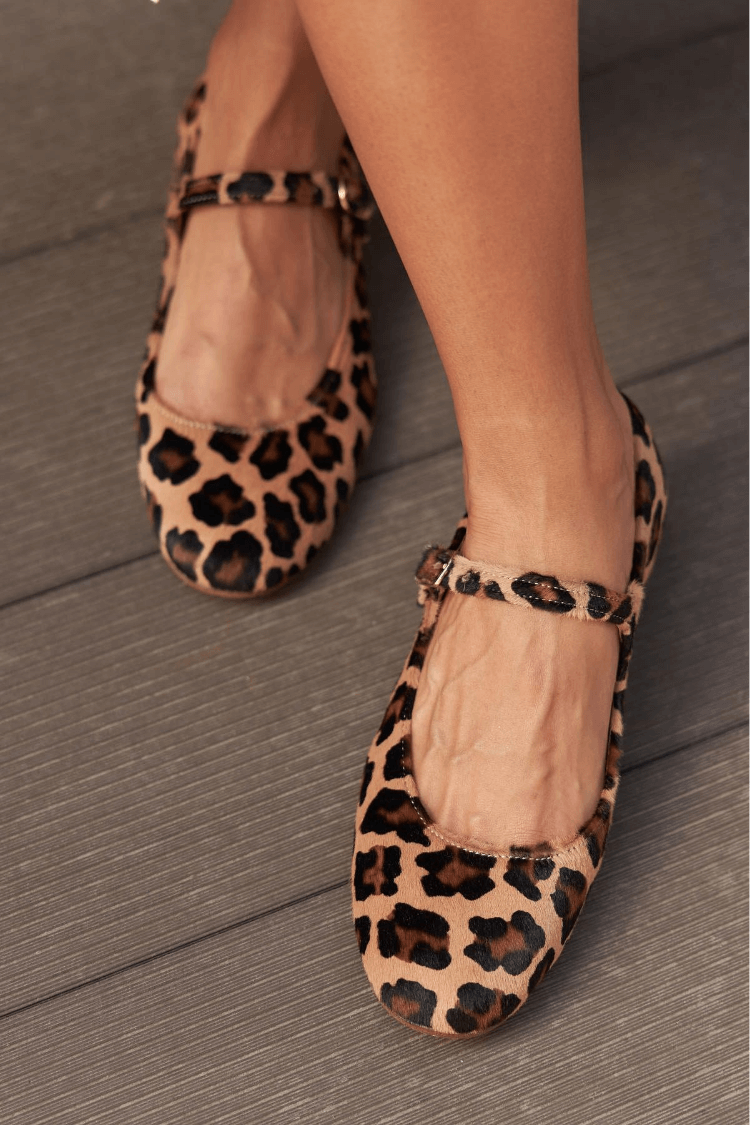 Ballerinas aus Kunstfell mit Leopardenmuster, Schnallenriemen und runder Zehenpartie