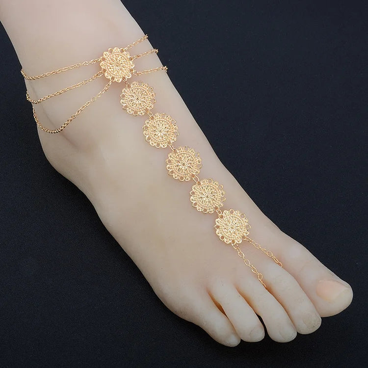 Boho-Fußkettchen mit Zehenring, Skulptur, Blumenscheibe und geschichteten Quasten