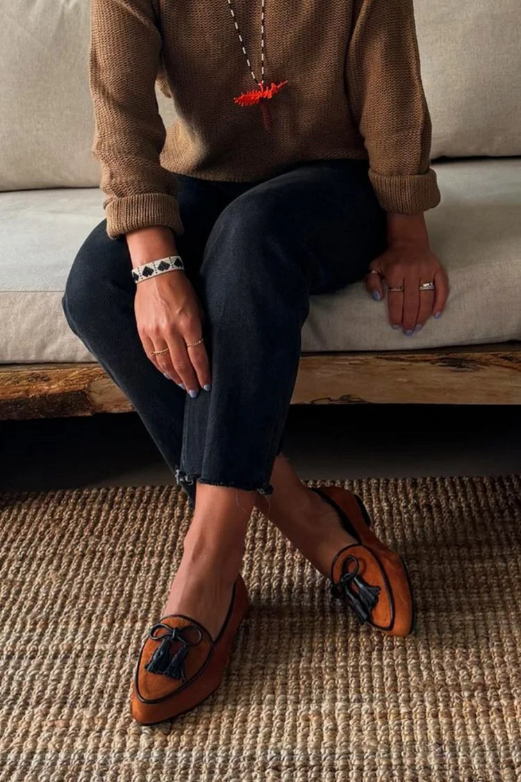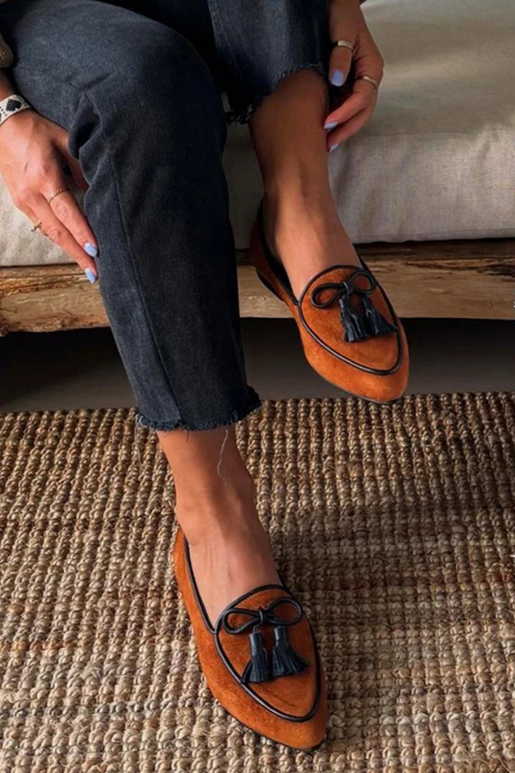 Braune Flache Schuhe mit Spitzennase und Farbblock-Quastenverzierung [Vorbestellung]