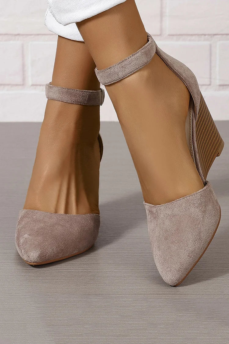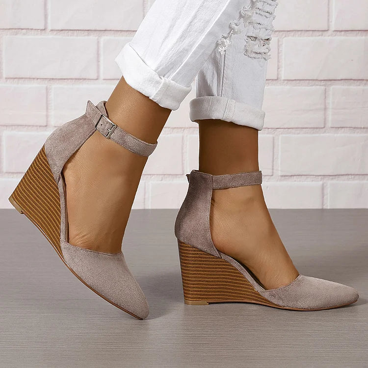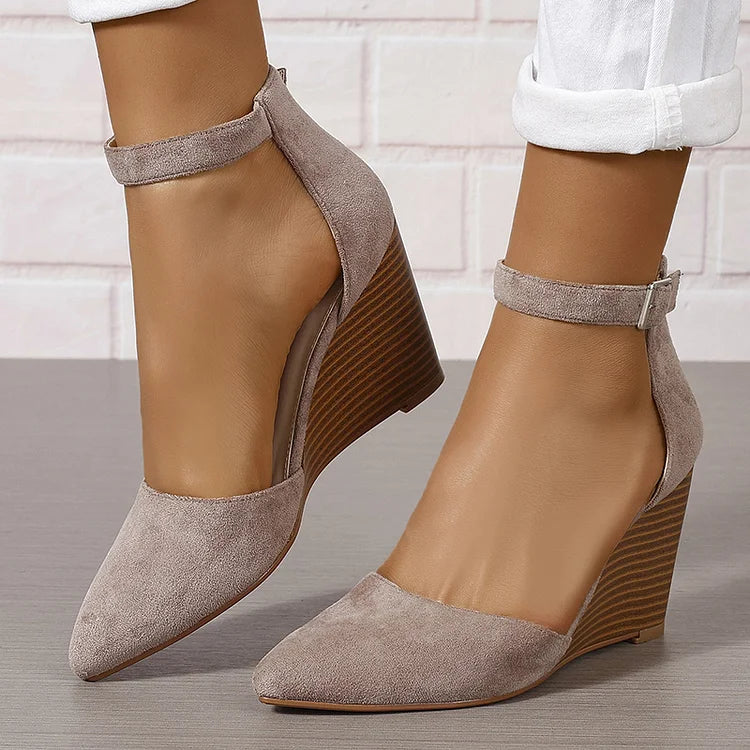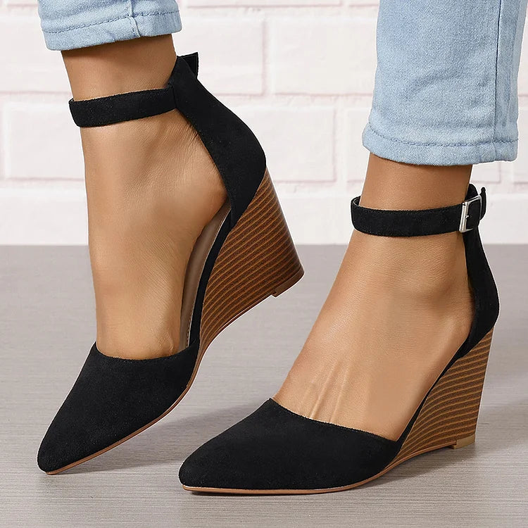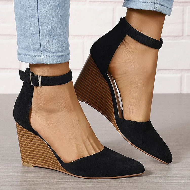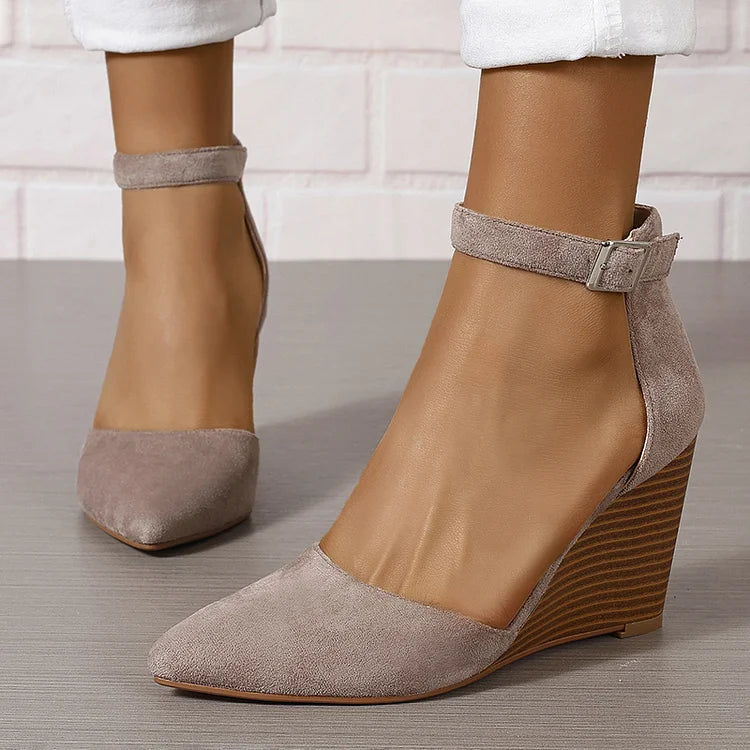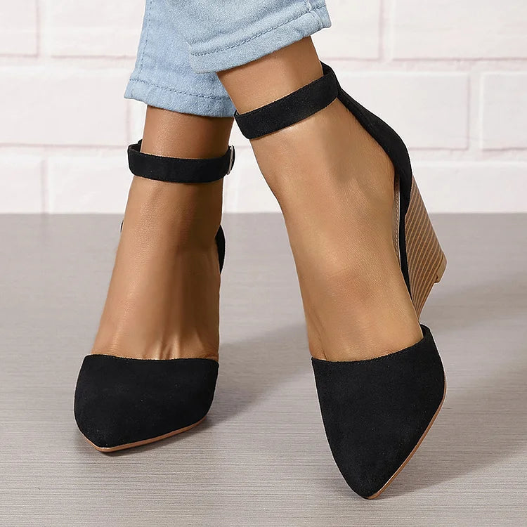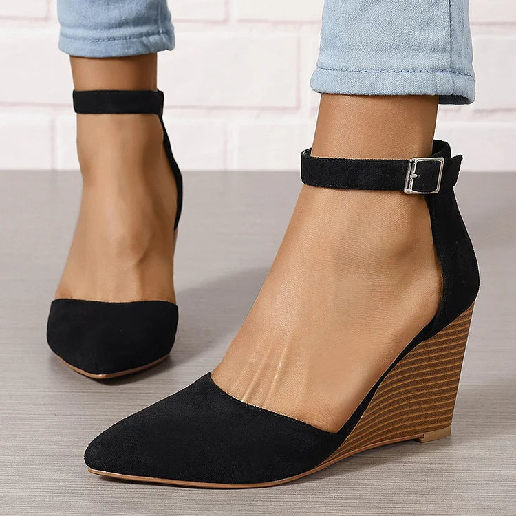 Einfarbige Keilabsätze mit spitzem Zehenbereich, Knöchelriemen und Schnalle