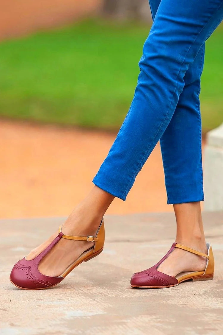 Farbblock-Burgunder-Flats mit runder Zehenpartie und T-Riemenverschluss [Vorbestellung]