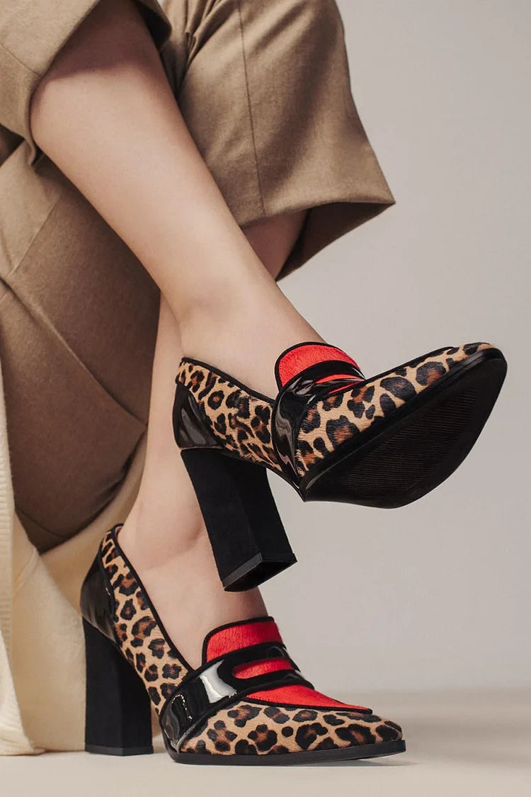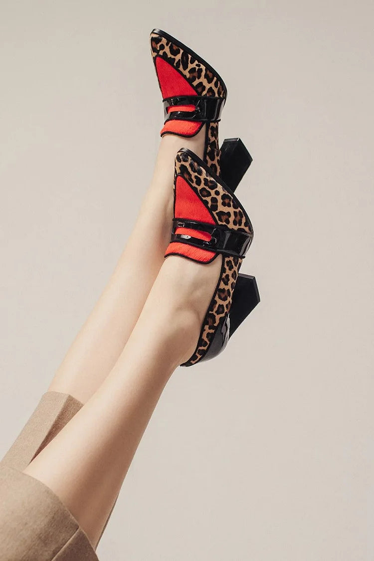Farbblock-Leopardenmuster mit spitzer Zehenpartie und klobigen Khaki-Absätzen [Vorbestellung]