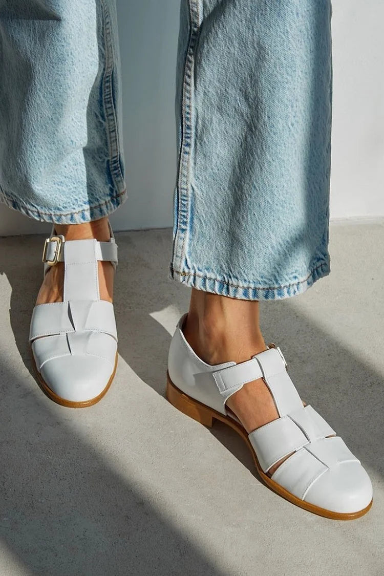 Häkel-Sandalen in Weiß mit breiter T-Riemen-Schnalle und geschlossener Zehenpartie