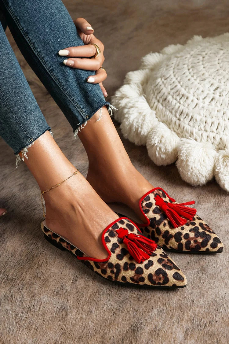 Mehrfarbige Mules mit Leopardenmuster, Quasten und Spitzzehen
