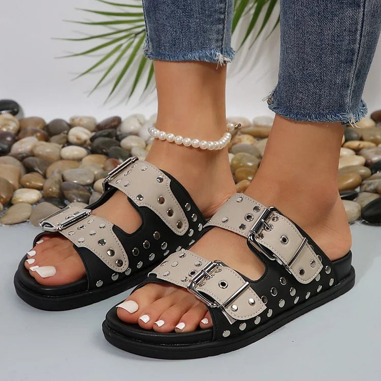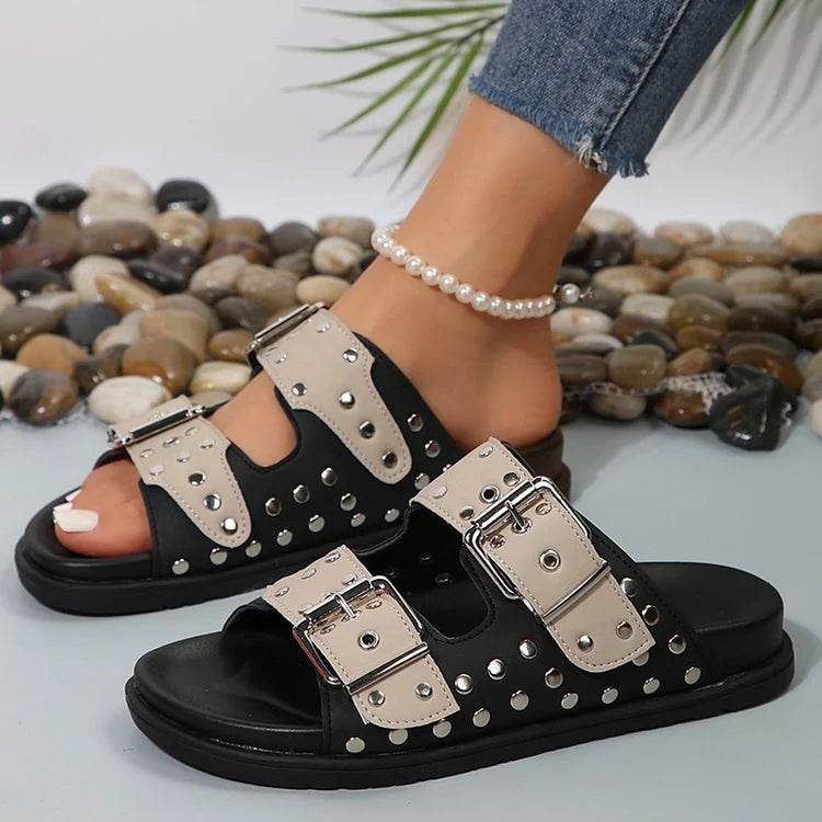 Patchwork-Hausschuhe mit Nietenverschluss und Riemen